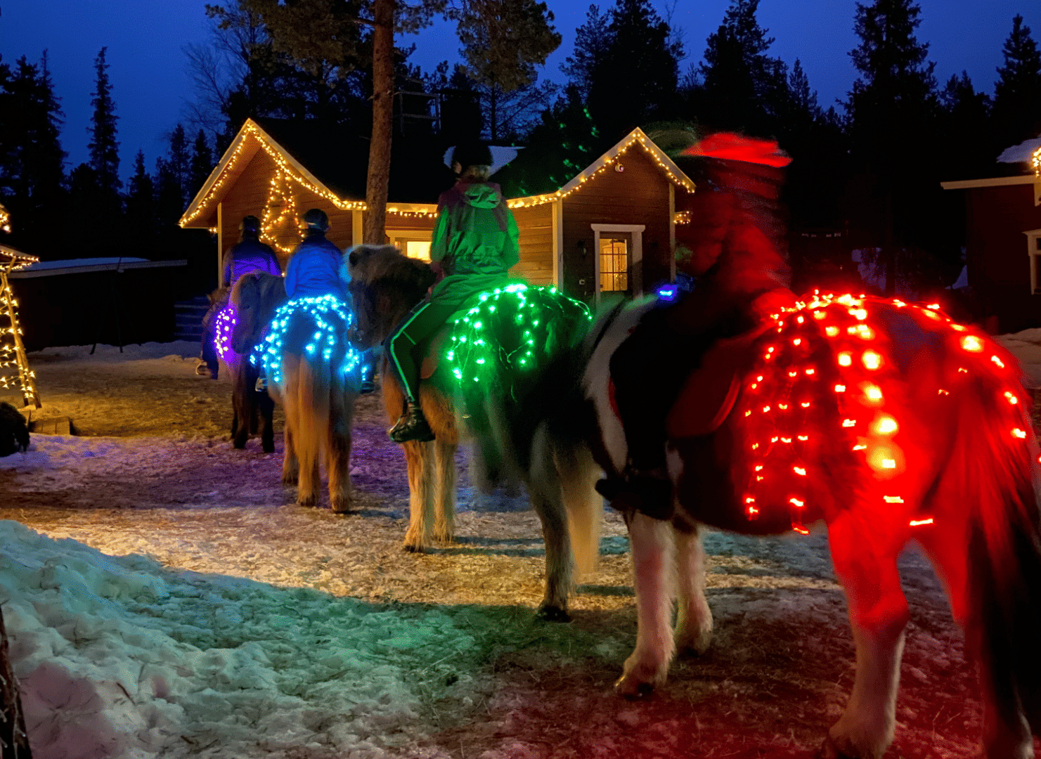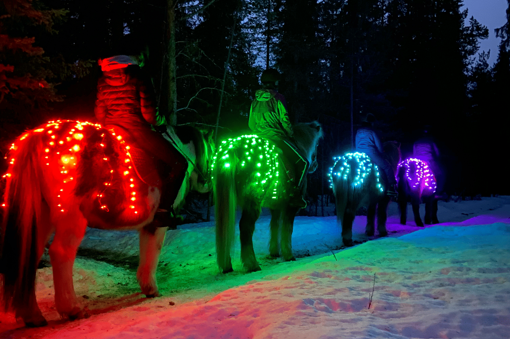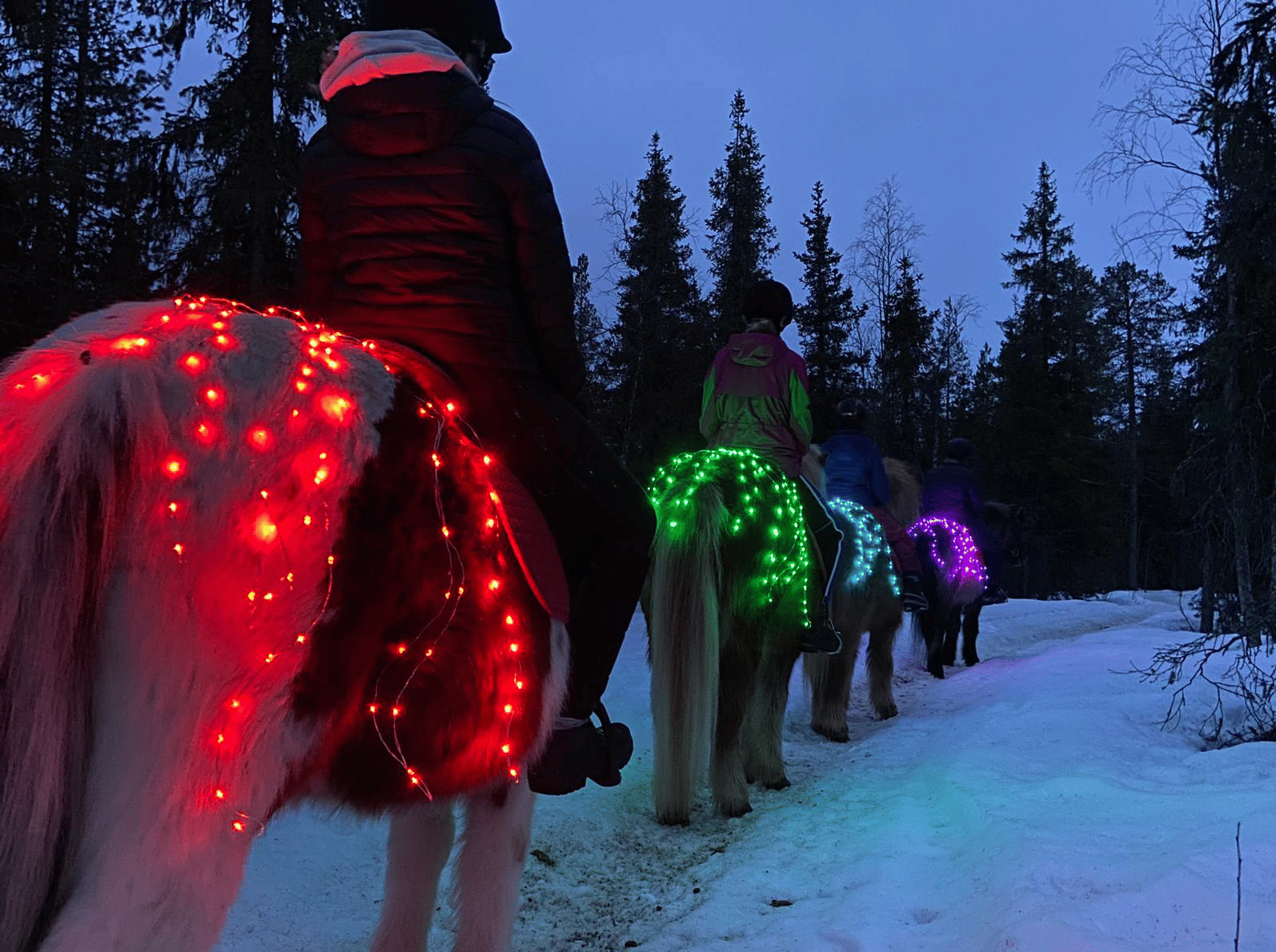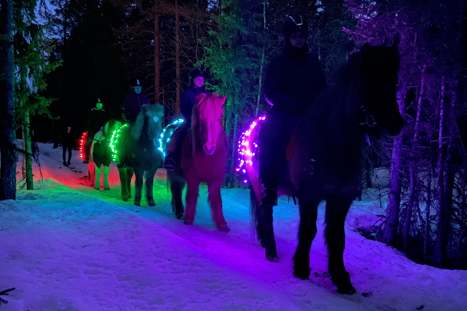 Come and experience Glow Riding with our charming and lovable Icelandic horses! During the trek, we'll ride in the Winter Wonderland with beautiful views of the fells surrounding us and explore Lapland's nature during the evening hours! Together, we'll bring light and color to the darkness with magical lights around us, worn by our very own horse friends! If we are lucky, we might also see nature's own glow, the Northern Lights!