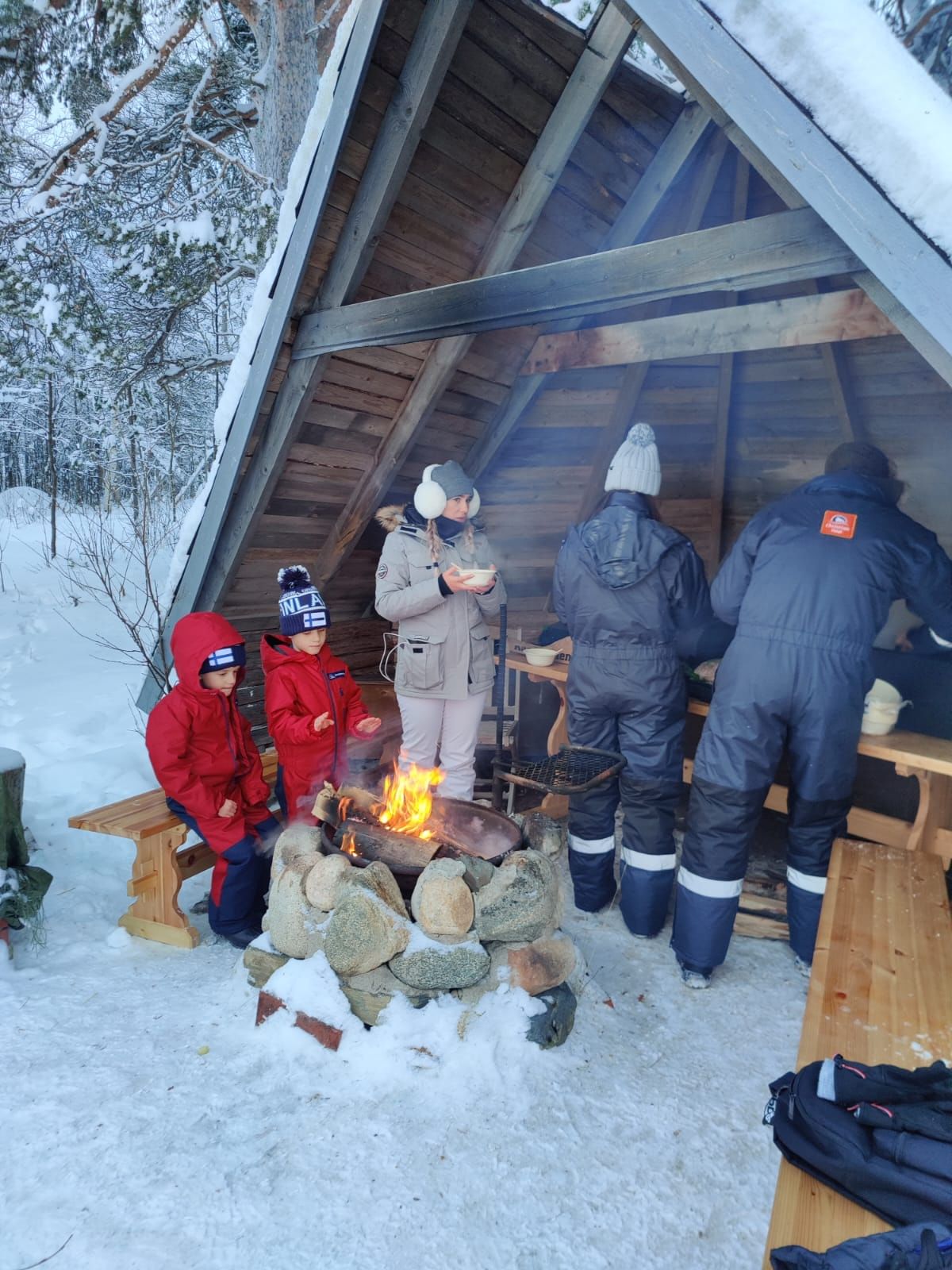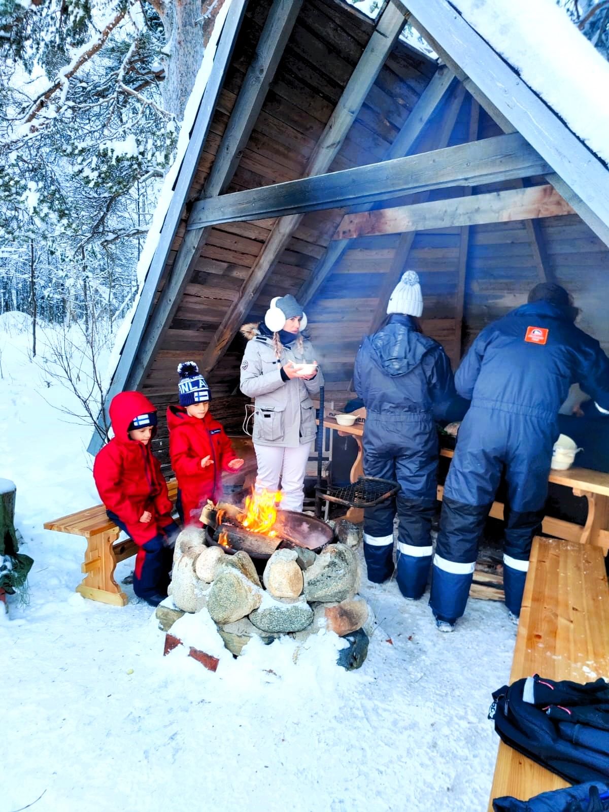 After fishing, warm up in our cozy wooden shelter, heated by a crackling wood fire. You’ll be served a delicious traditional salmon soup and a hot drink — a real Lapland comfort meal after time spent outdoors.
