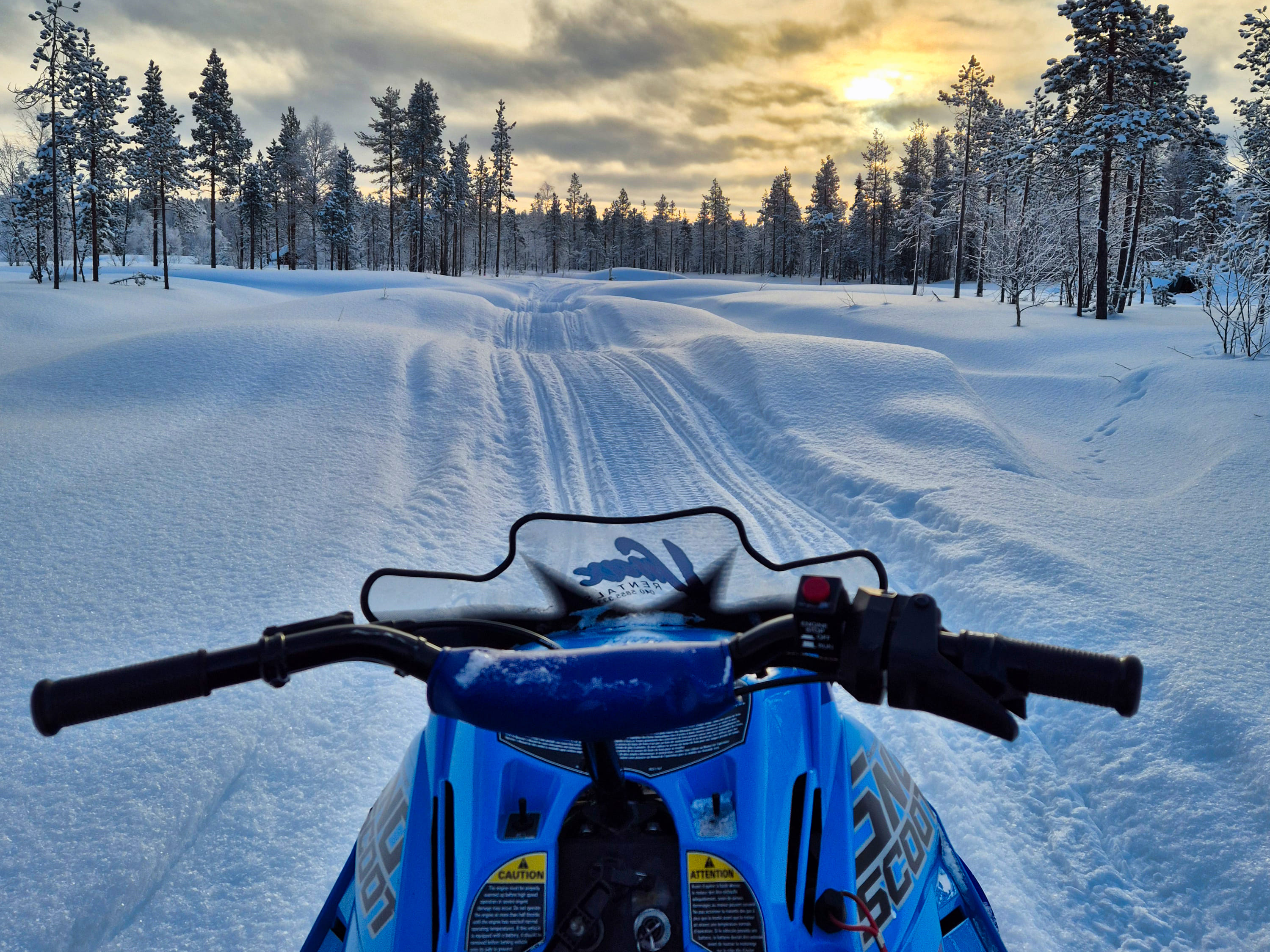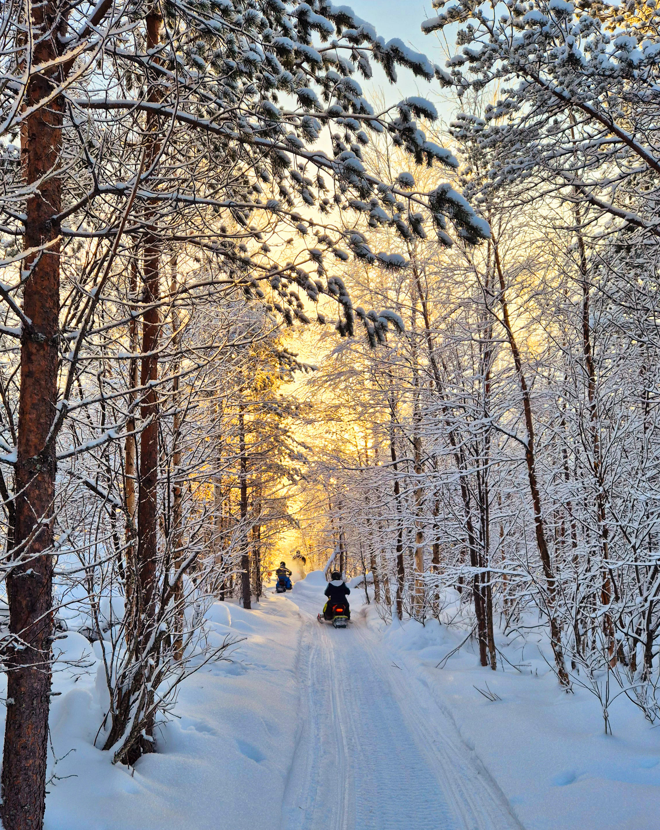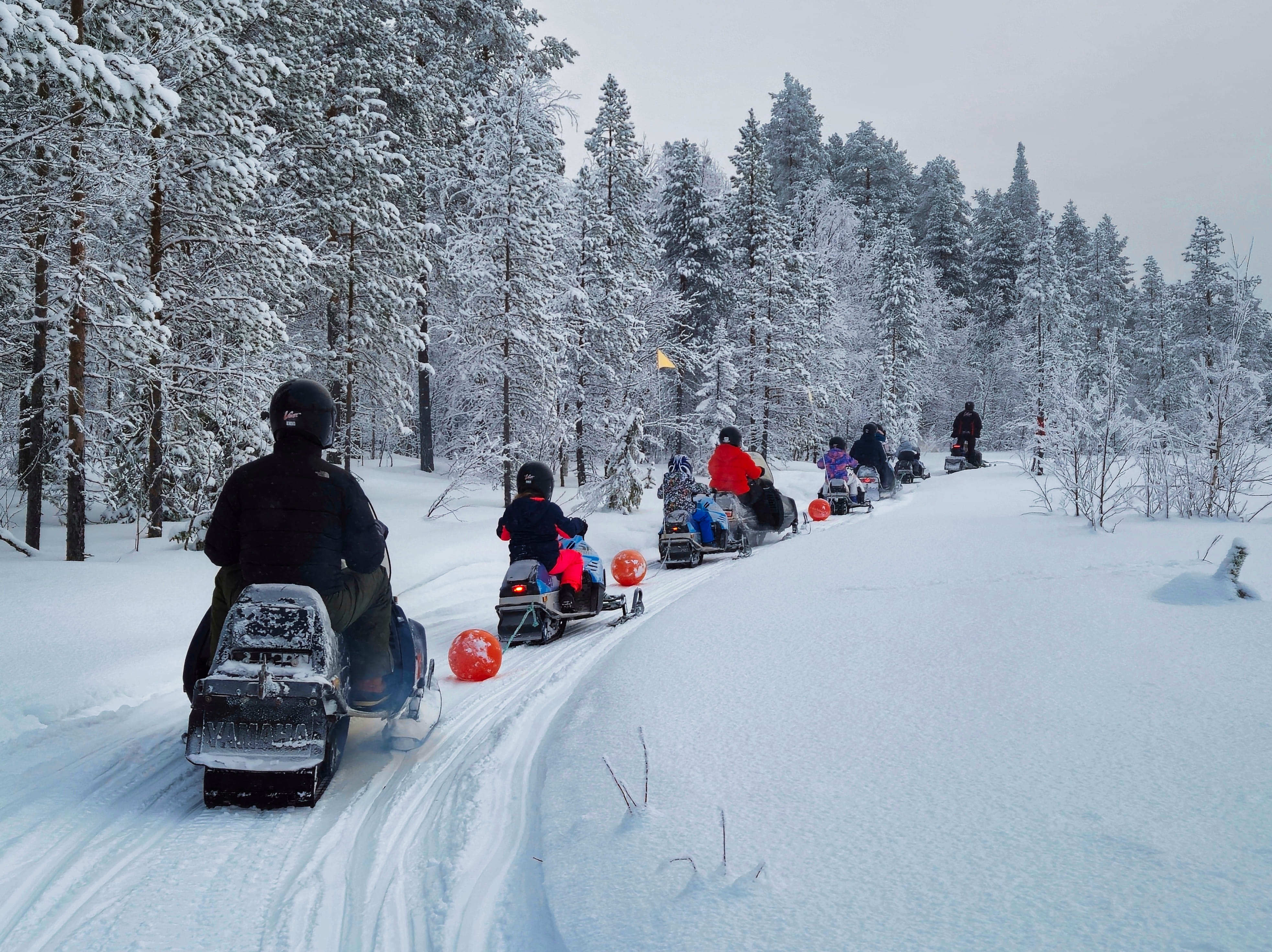 The snowmobile experience lasts about one hour, starting with safety instructions and some driving practice. After that, we head out for around 30 minutes of scenic riding through snowy forests and frozen swamps, with Levi Fell in the background. ❄️