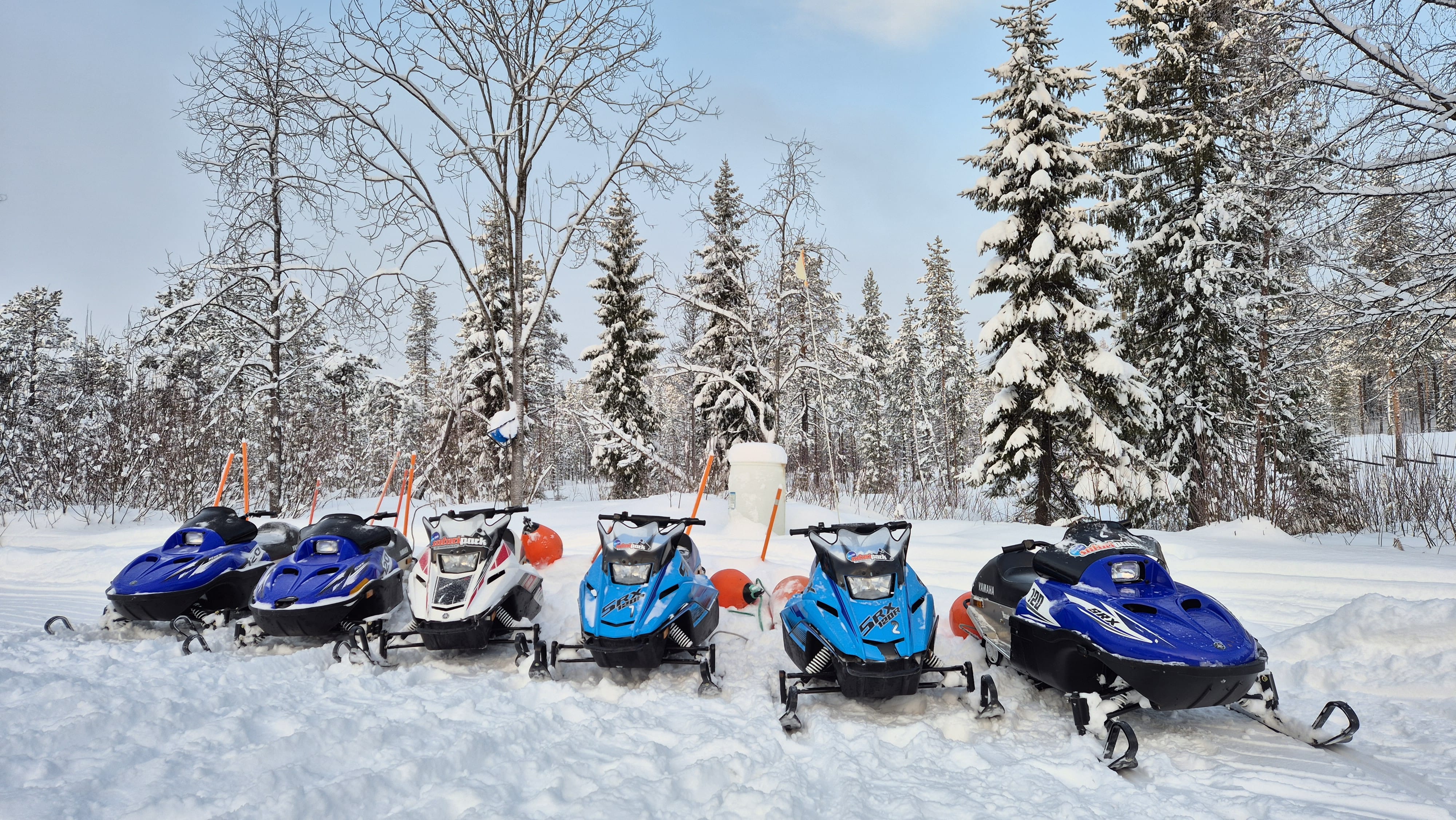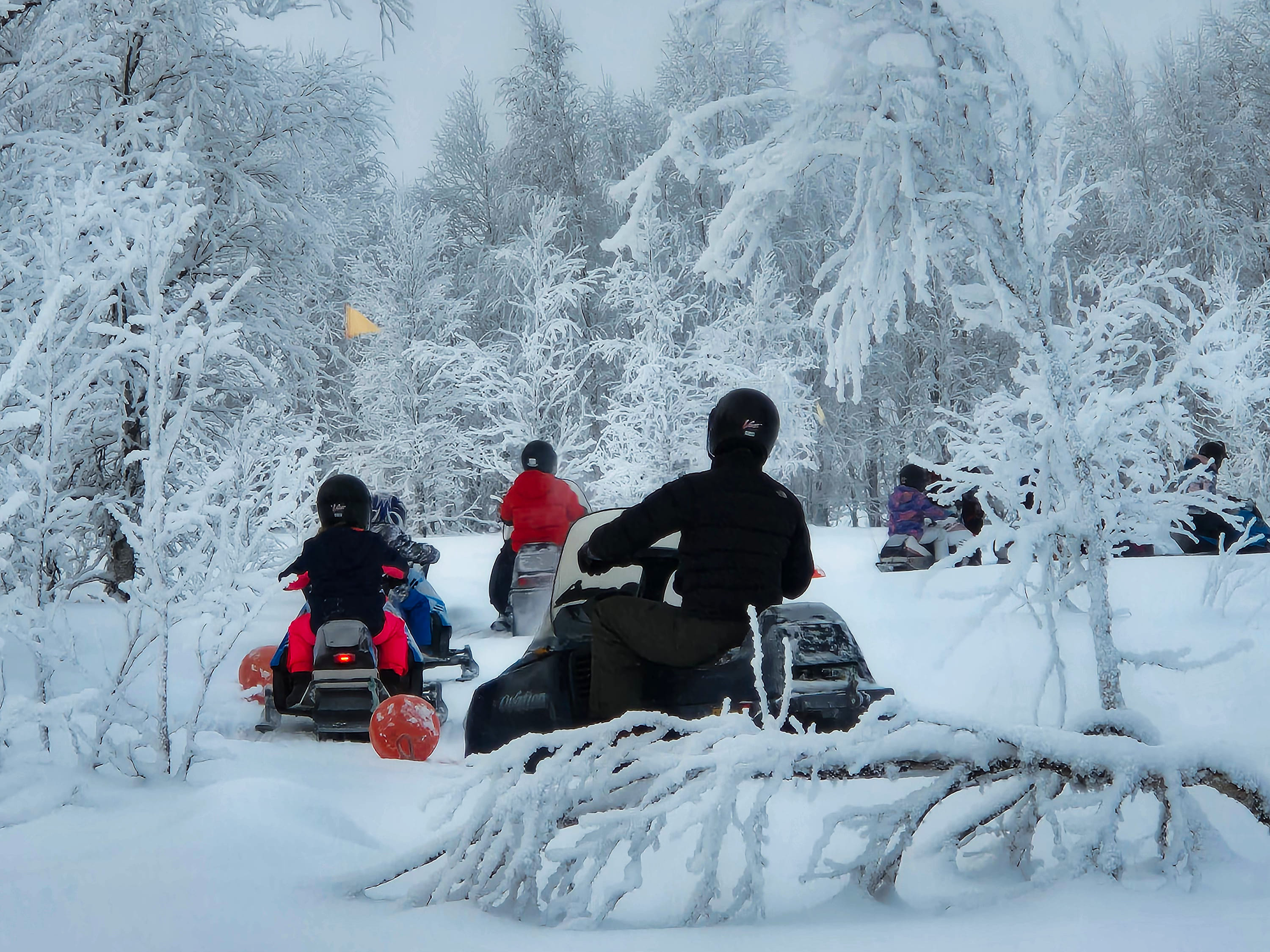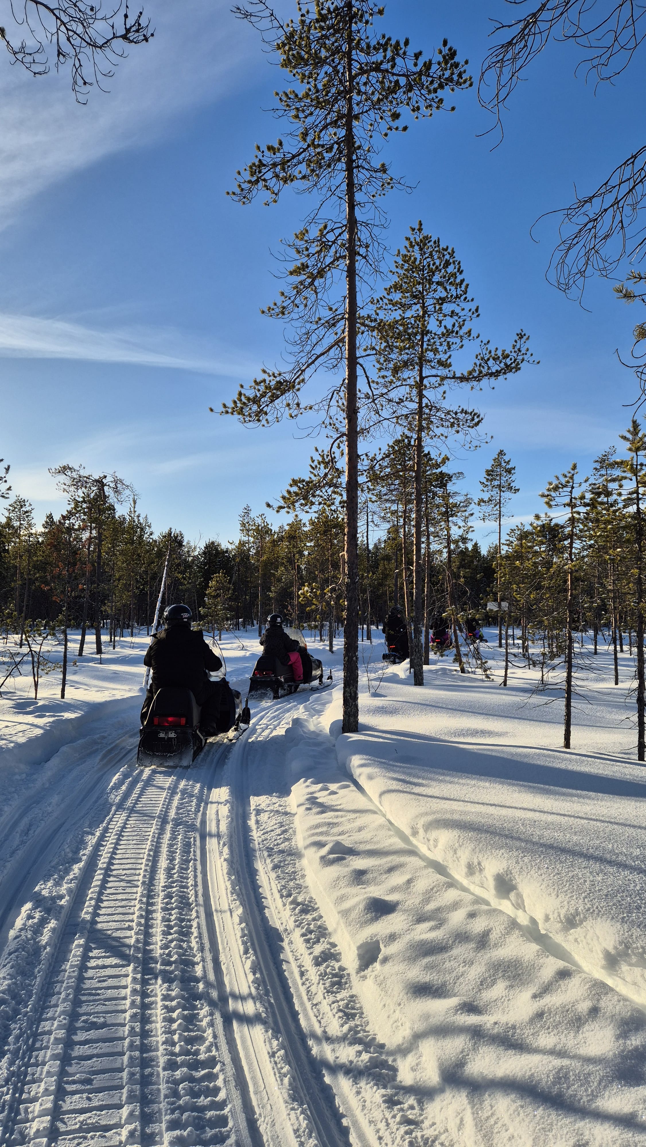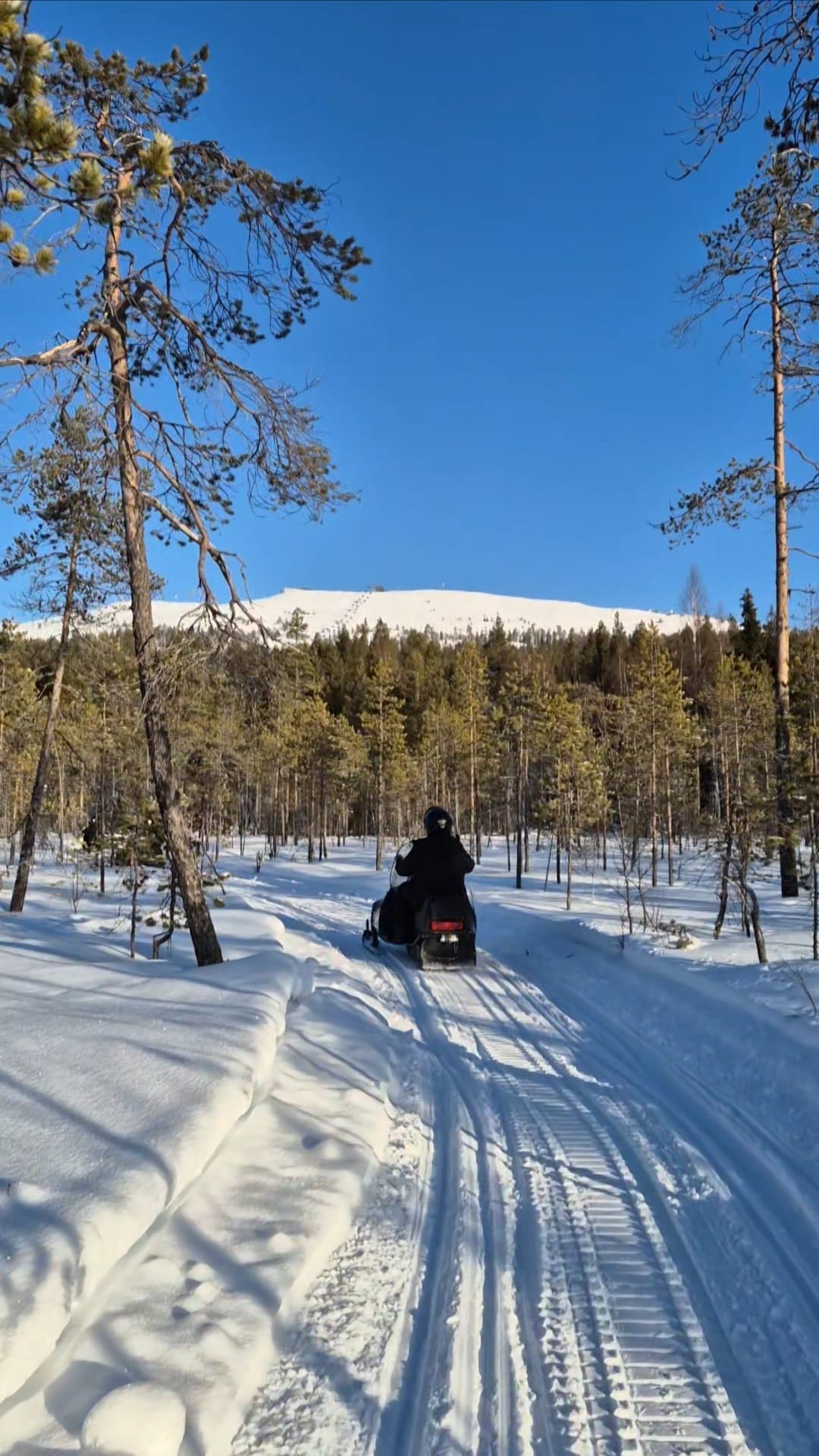 The snowmobile experience lasts about one hour, starting with safety instructions and some driving practice. After that, we head out for around 30 minutes of scenic riding through snowy forests and frozen swamps, with Levi Fell in the background. ❄️