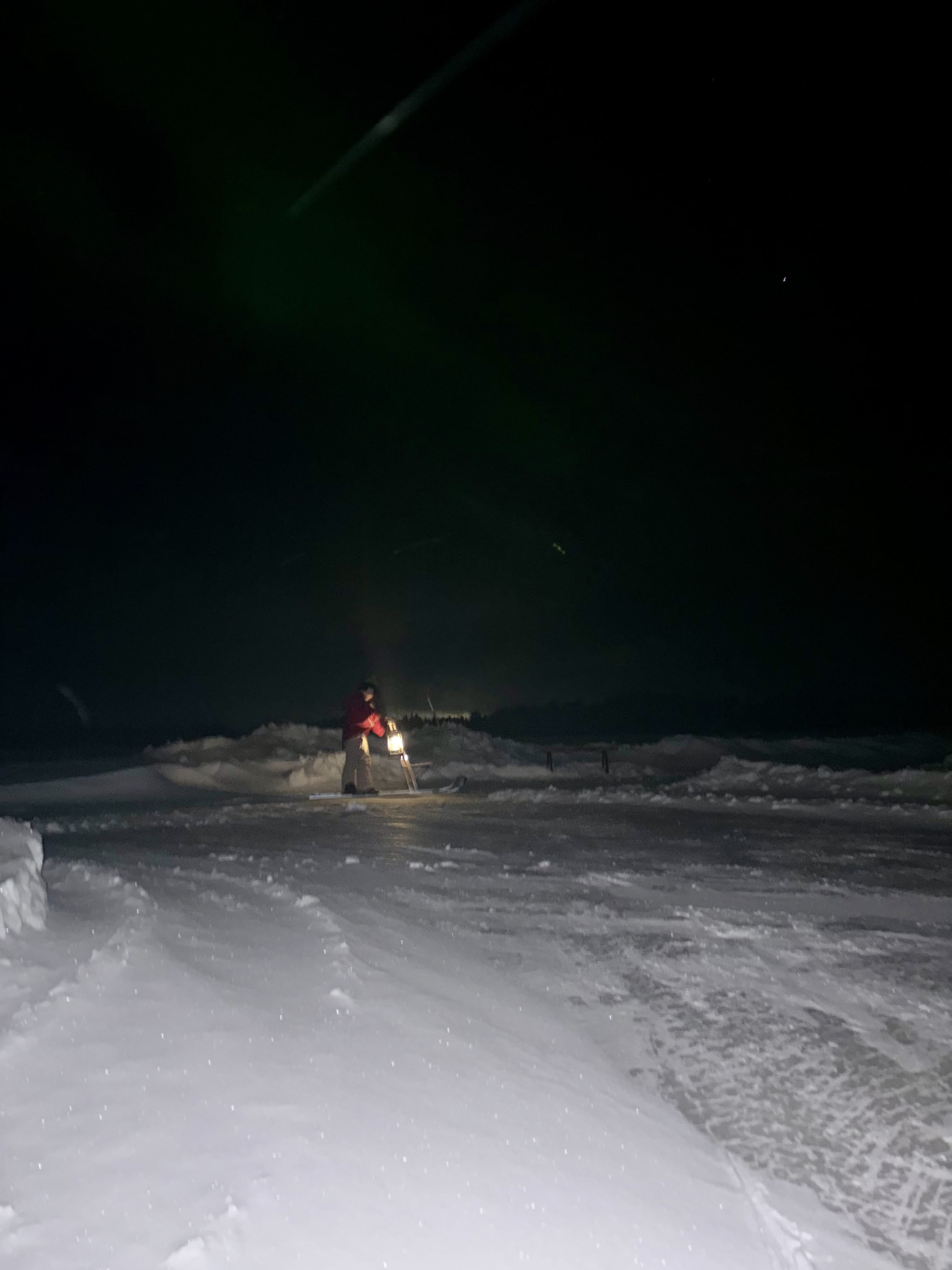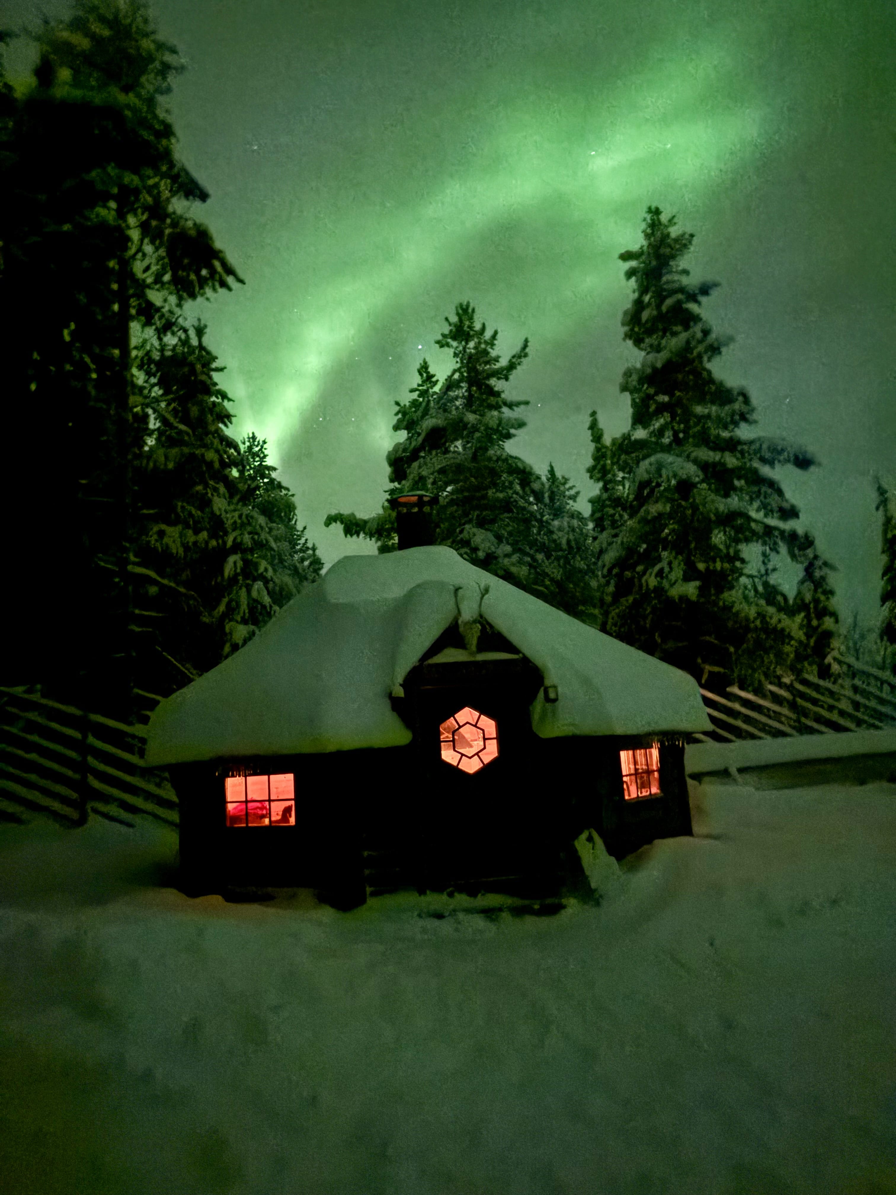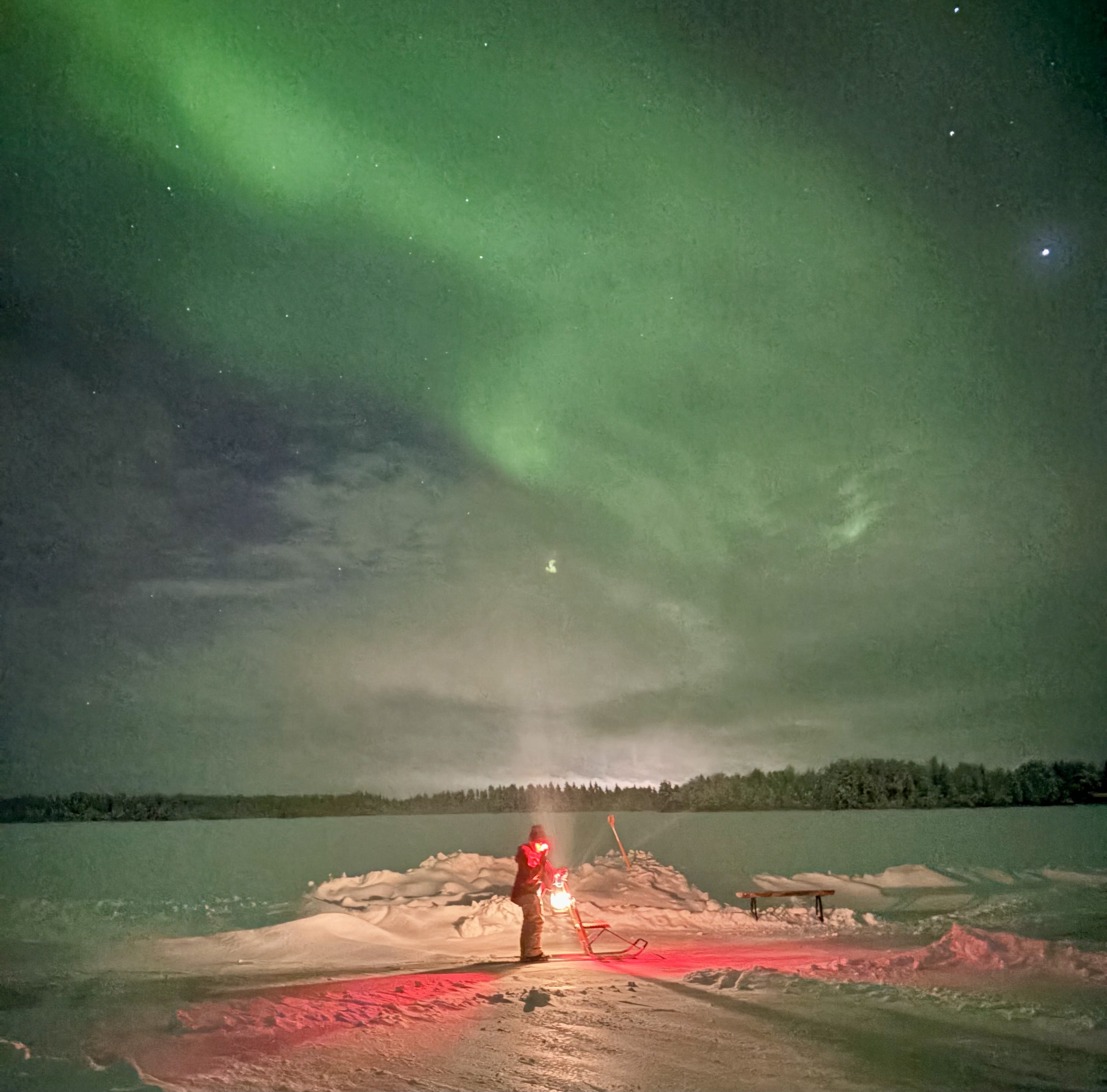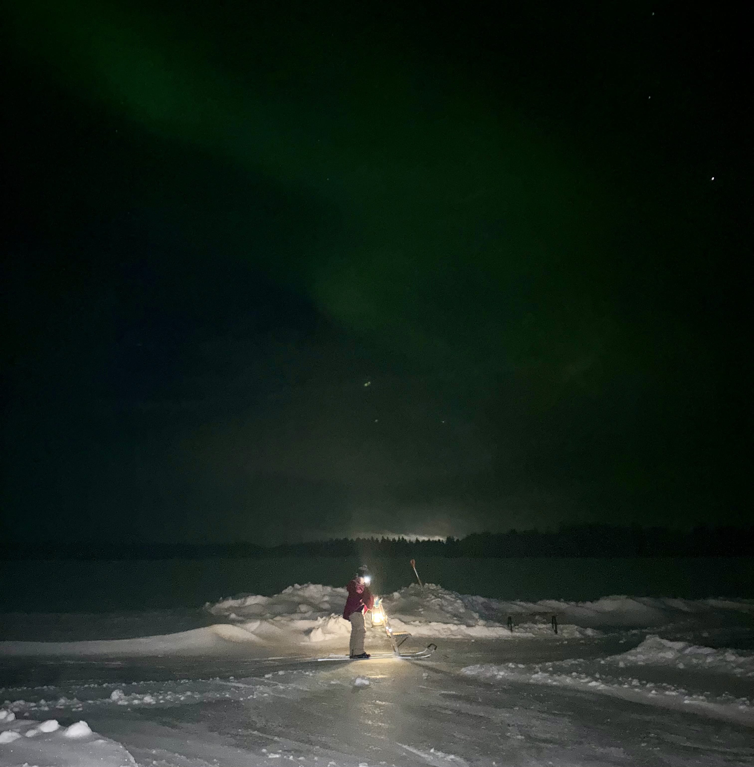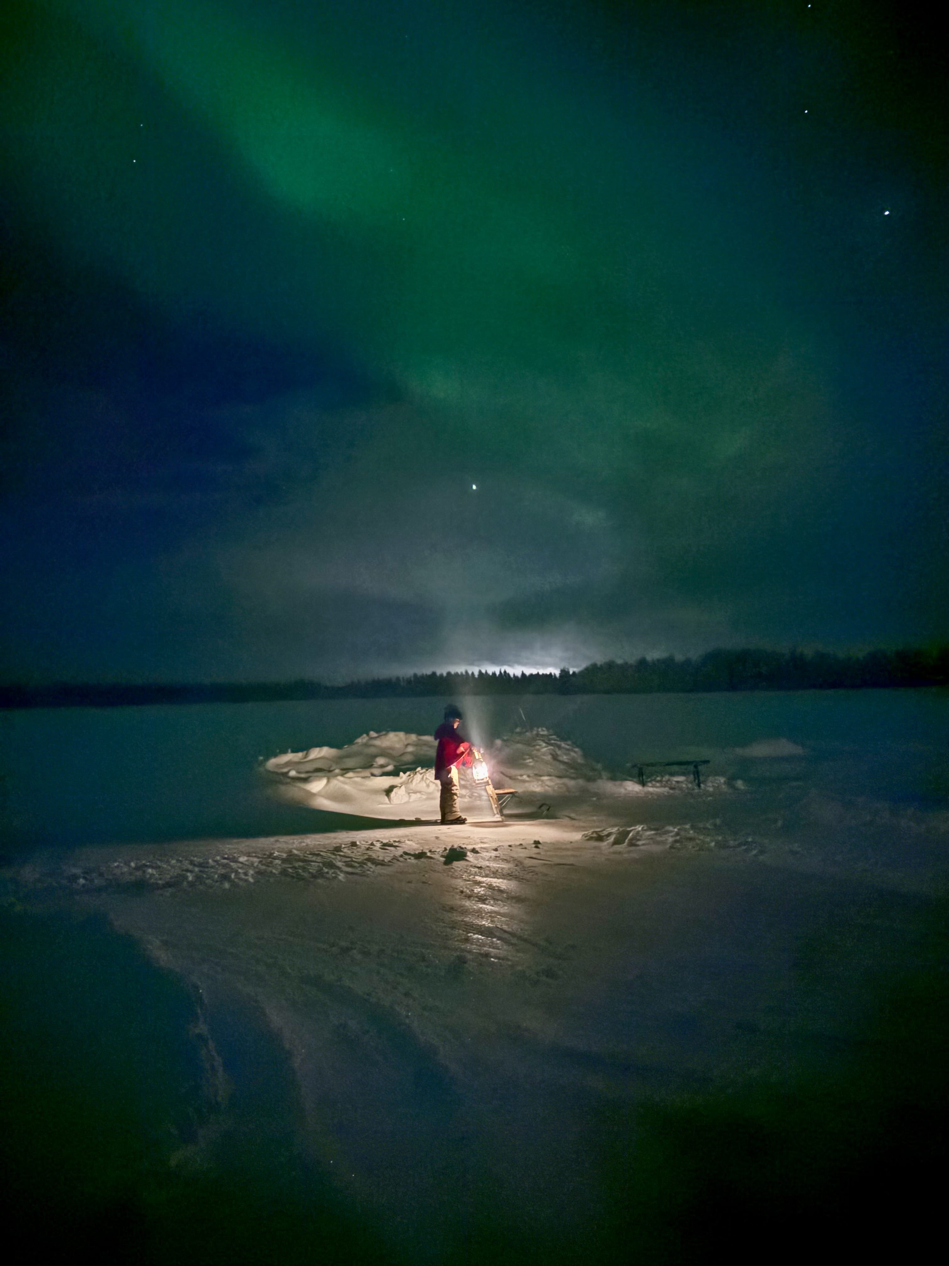 Your guide will provide a short safety briefing and introduce the kick sleds and lanterns. Then we’ll glide from the yard to the frozen lake, carrying lanterns that add a warm glow to the winter night. On the open lake ice, away from light pollution, we begin our calm and atmospheric Northern Lights hunt—moving at an easy pace with time to pause, watch the sky, and enjoy the quiet beauty of Lapland.