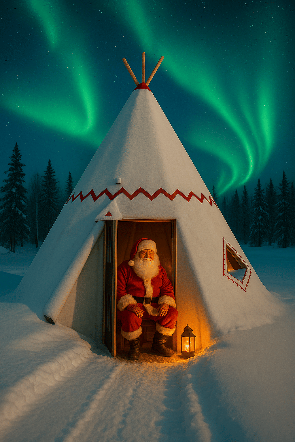 A magical daytime visit at Arctic Shaman Village – private Santa meeting in a cozy Lappish tipi, children’s names remembered, gifts, photos, and certificates.